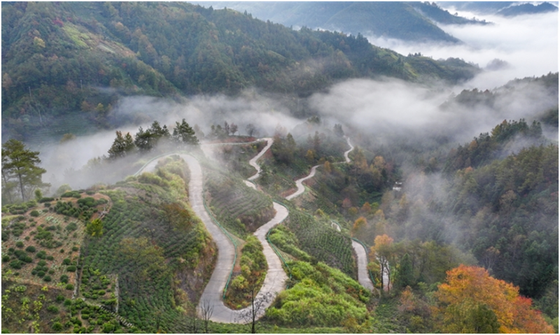 In the Yueli Village of Wuyang Town, Shexian County, the multicolored slopes and the sinuous mountain roads jointly delineate a magnificent winter tableau.