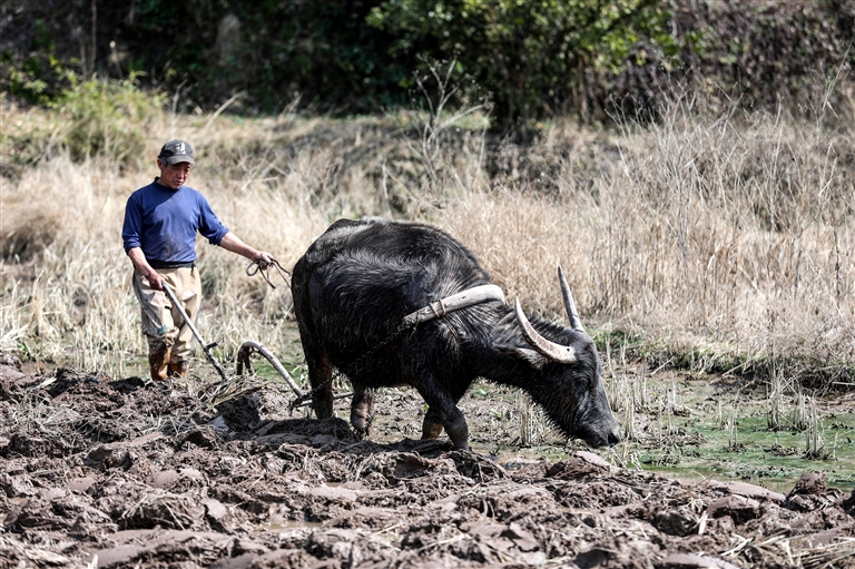 休寧縣黃村,老農(nóng)趕著水牛在小型地塊里翻耕,勾勒出一幅質(zhì)樸的田園畫面。 樊成柱/攝